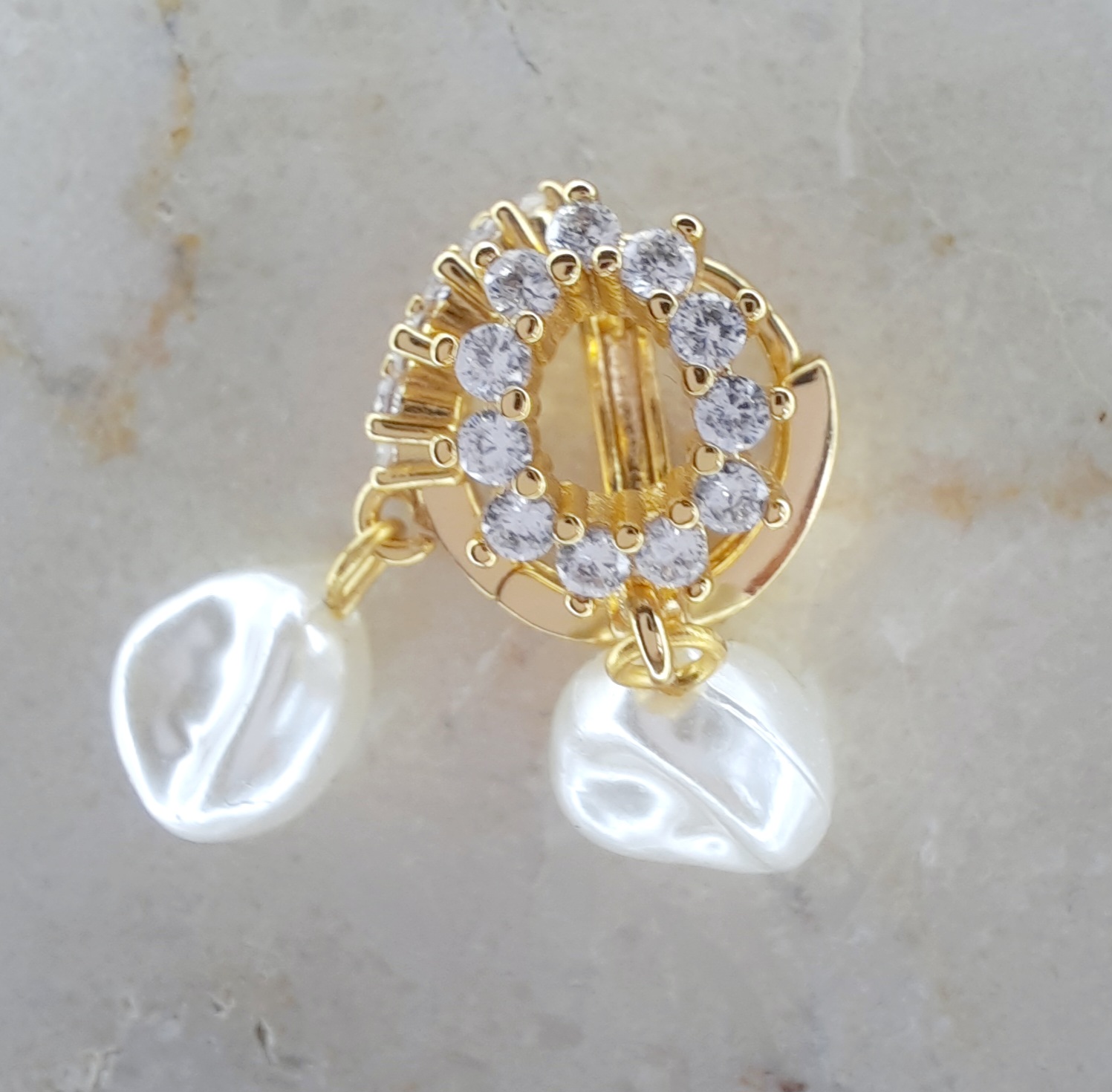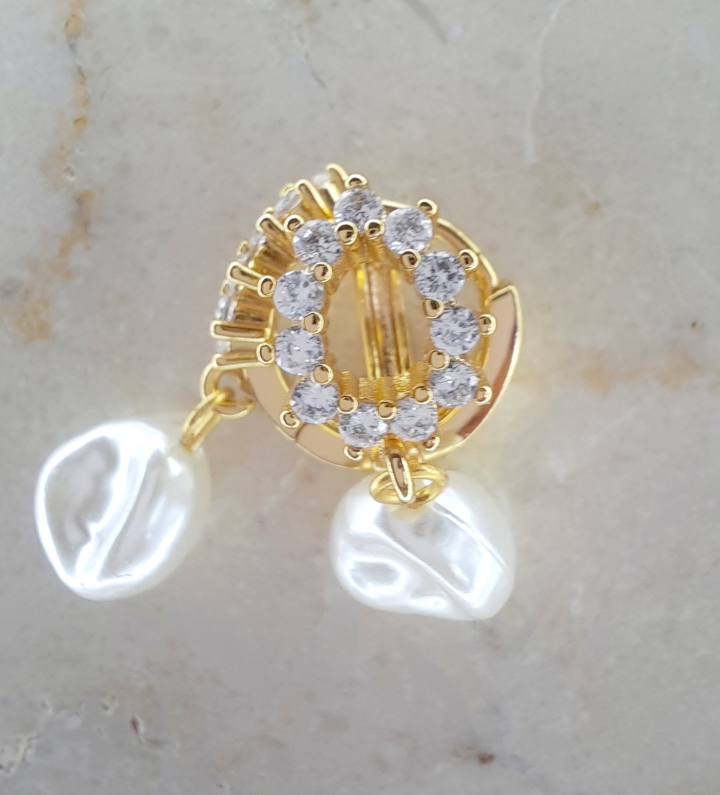 Discover a new kind of elegance with the Celeste Orbit Pearl Earrings. These striking earrings feature a radiant gold-tone circular motif, encrusted with sparkling crystals that catch the light from every angle. Suspended below are two luminous, organically-shaped artificial pearls, each one unique and full of character.
