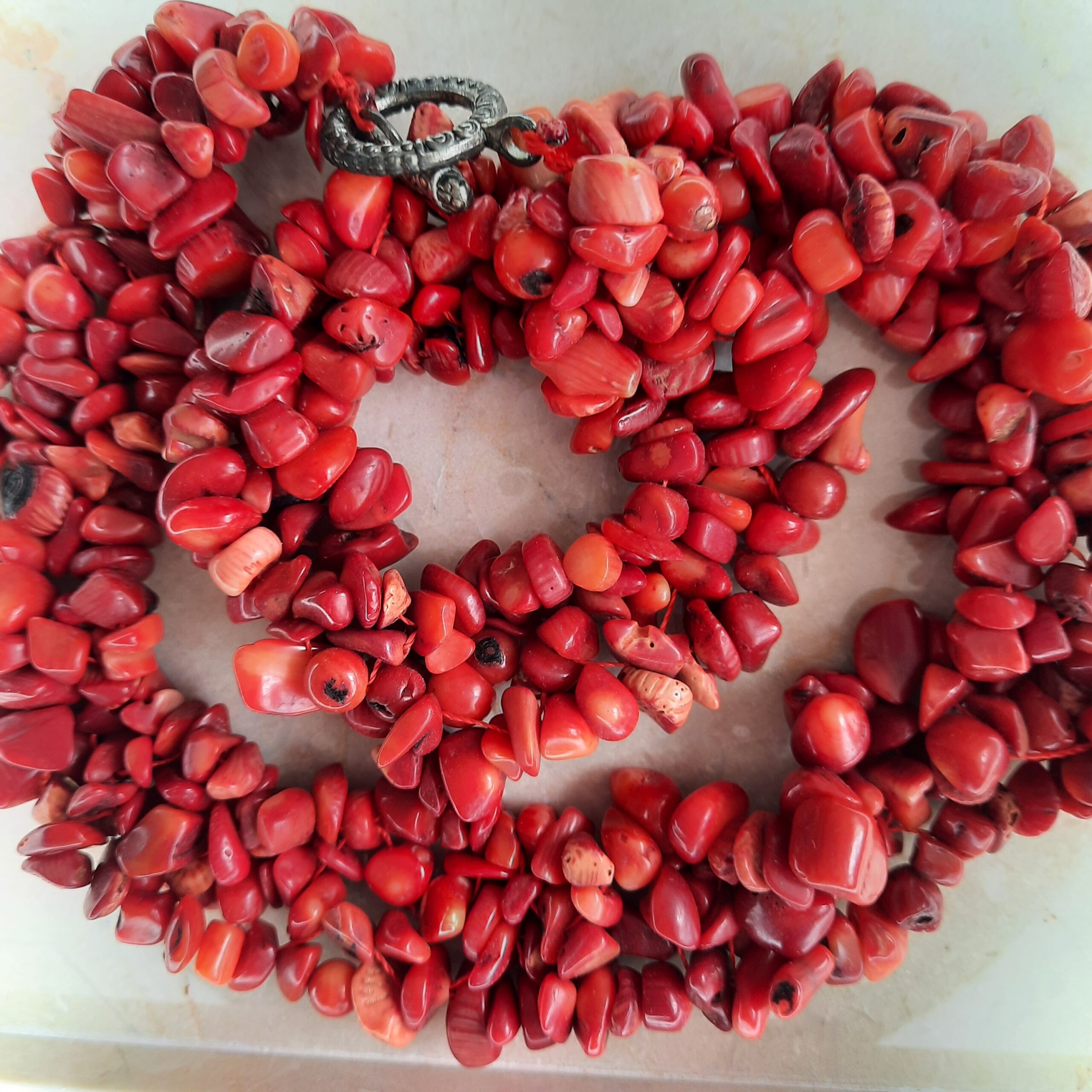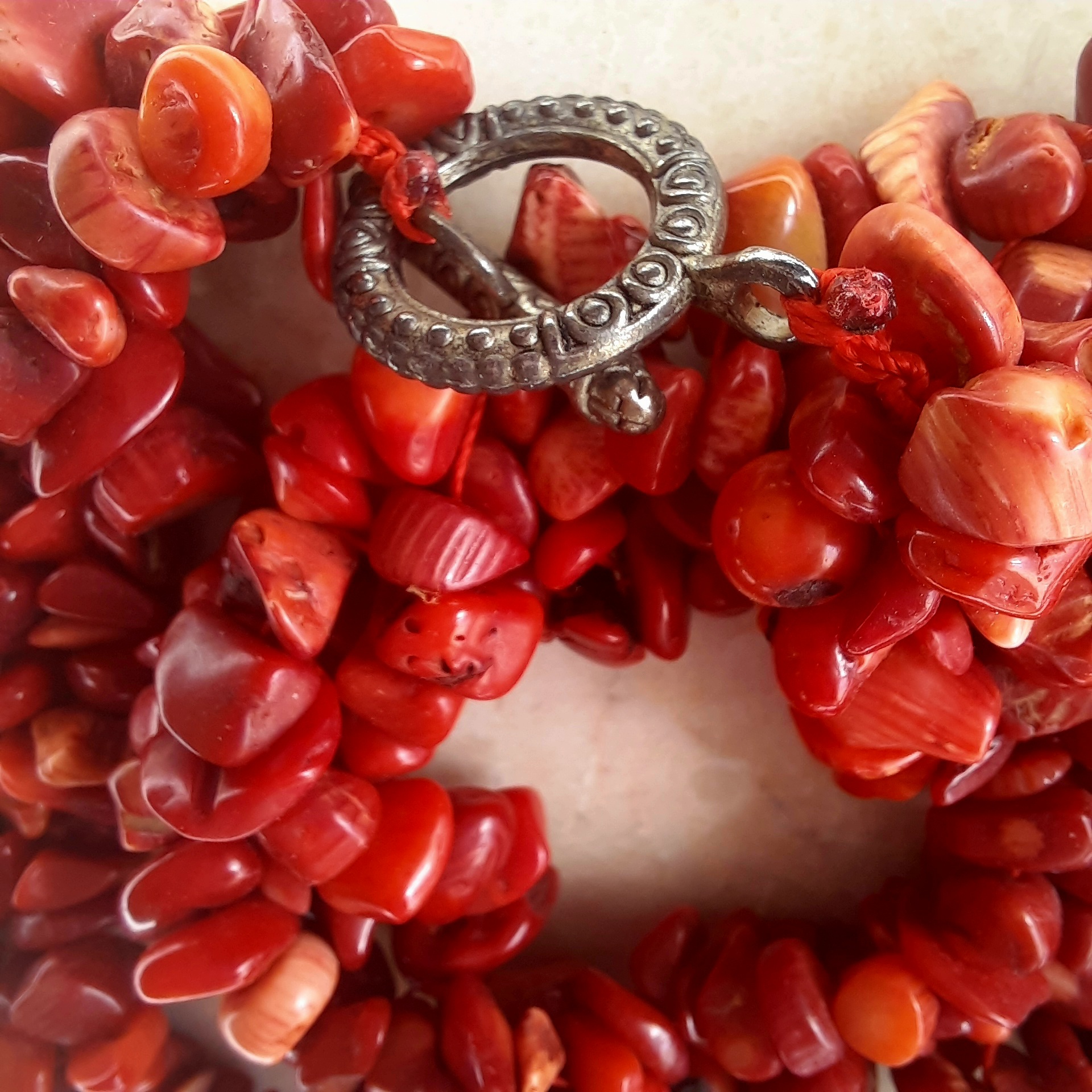 Genuine red coral chips, hand-strung in multiple strands for maximum impact