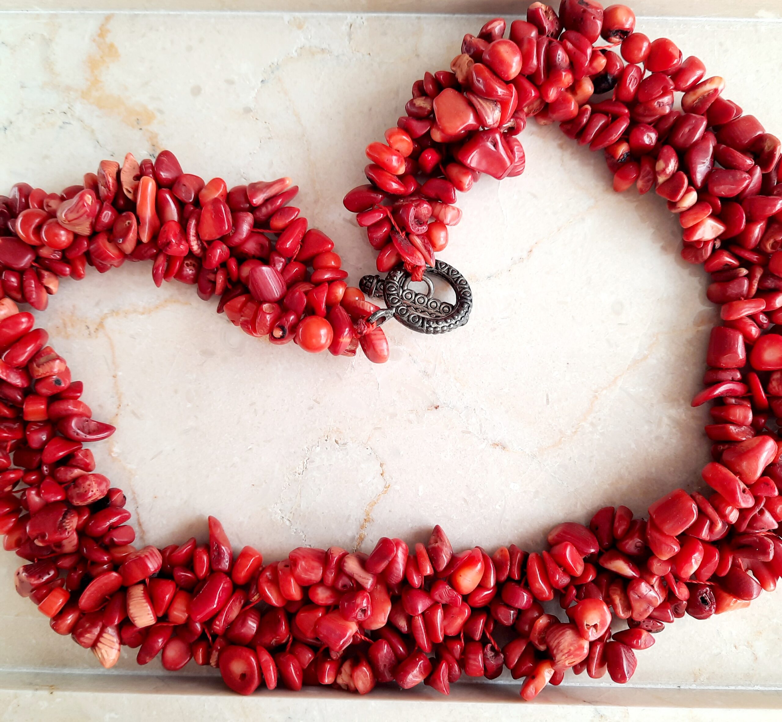 Finished with an ornate, vintage-inspired toggle clasp, this necklace brings together organic beauty and artisanal detail. The rich red hues evoke the energy of the sea and the warmth of sunlit shores, making it a perfect centerpiece for both special occasions and everyday elegance.