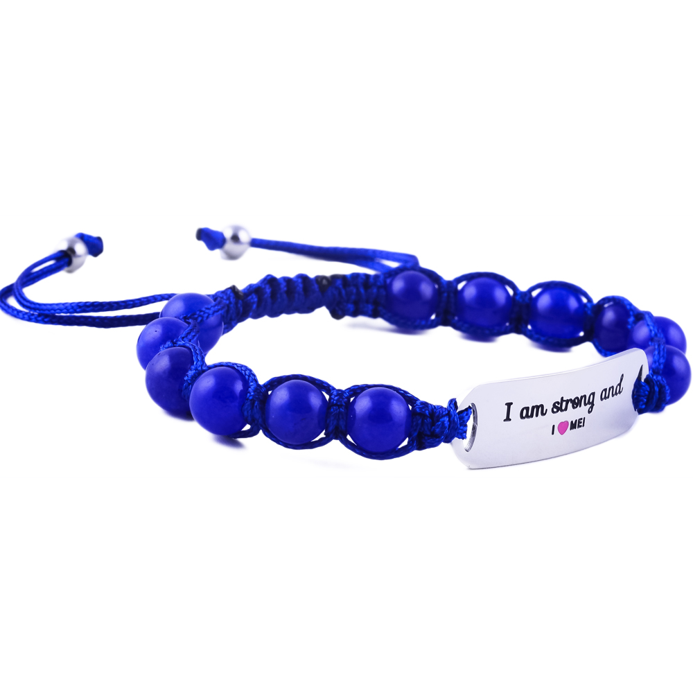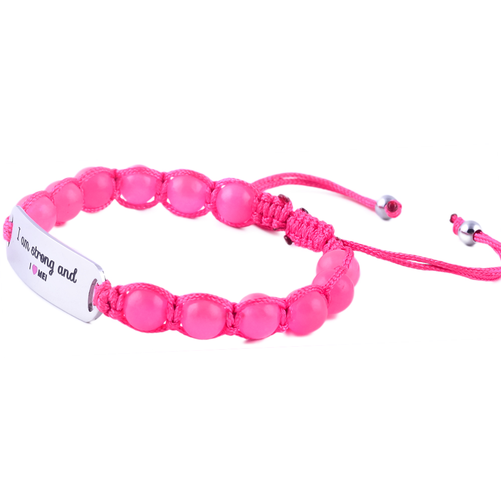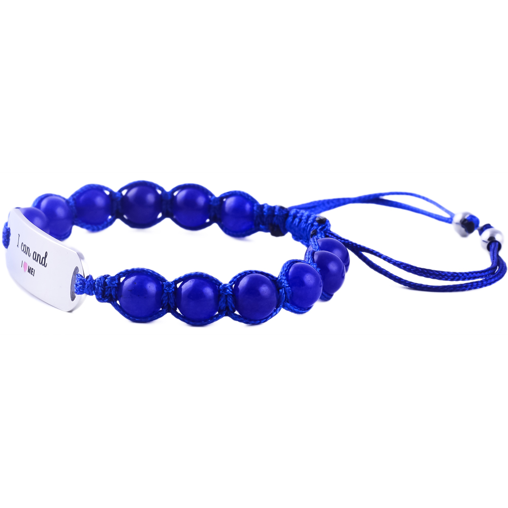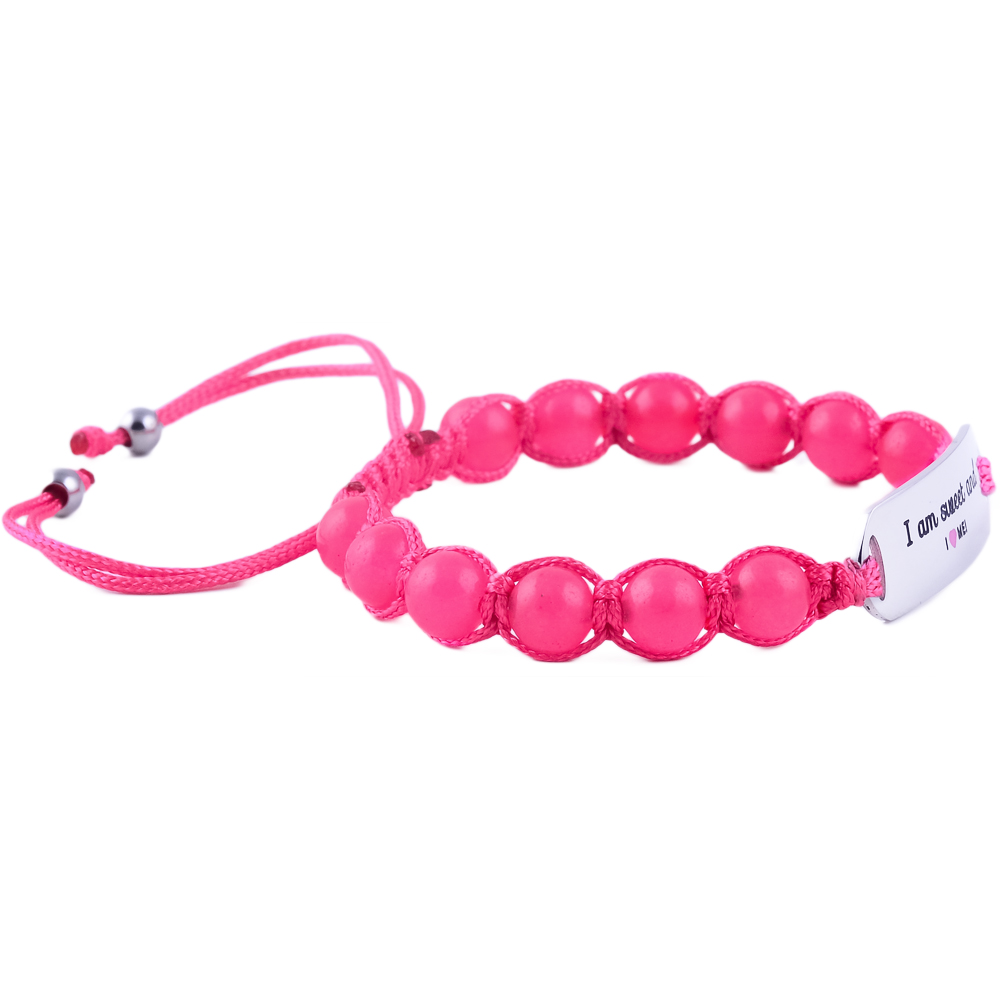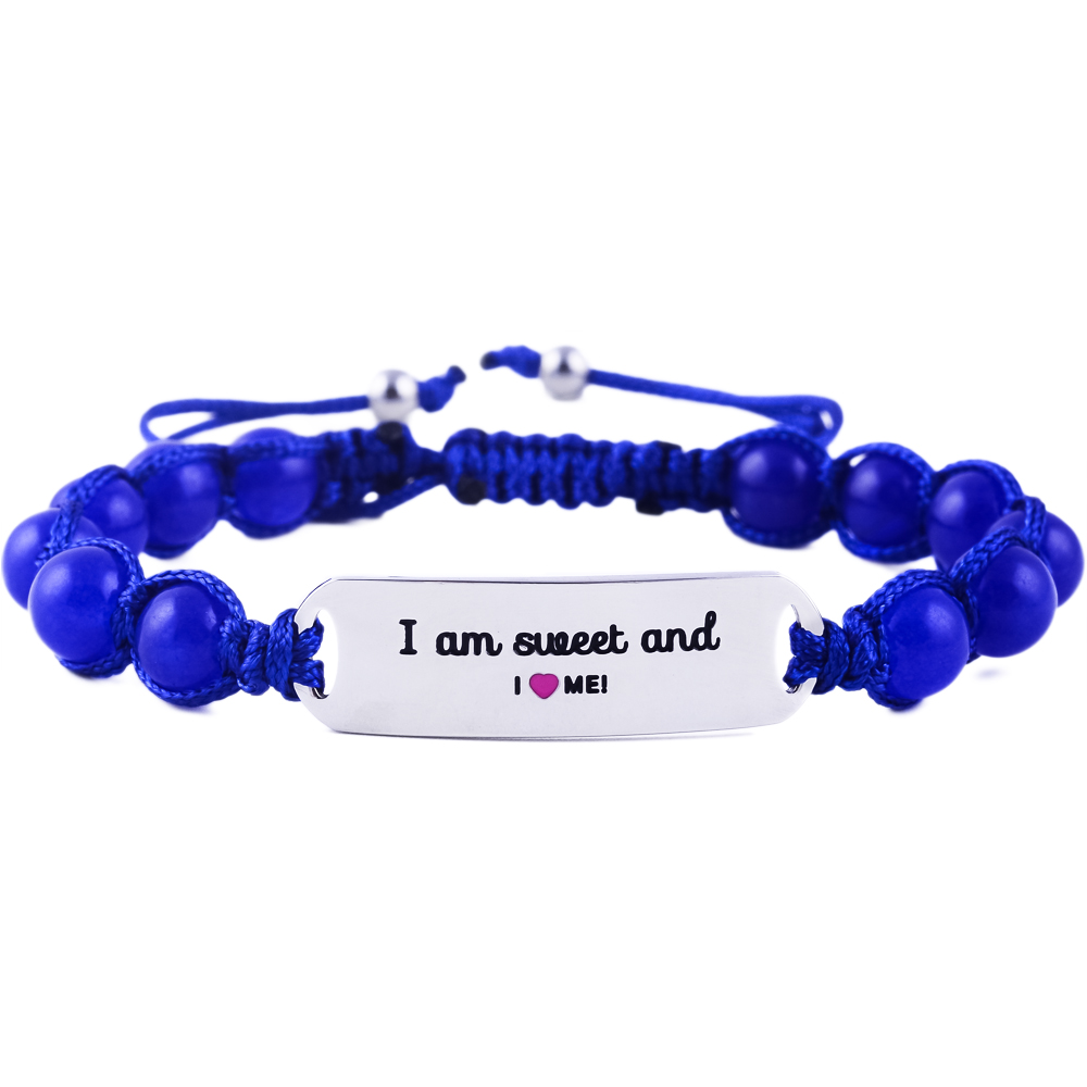 Charming “I Am Sweet & I Love Me” kids’ bracelet in engraved stainless steel with pink or blue jade stones. Adjustable, durable, and the perfect gift to inspire self-love in children.