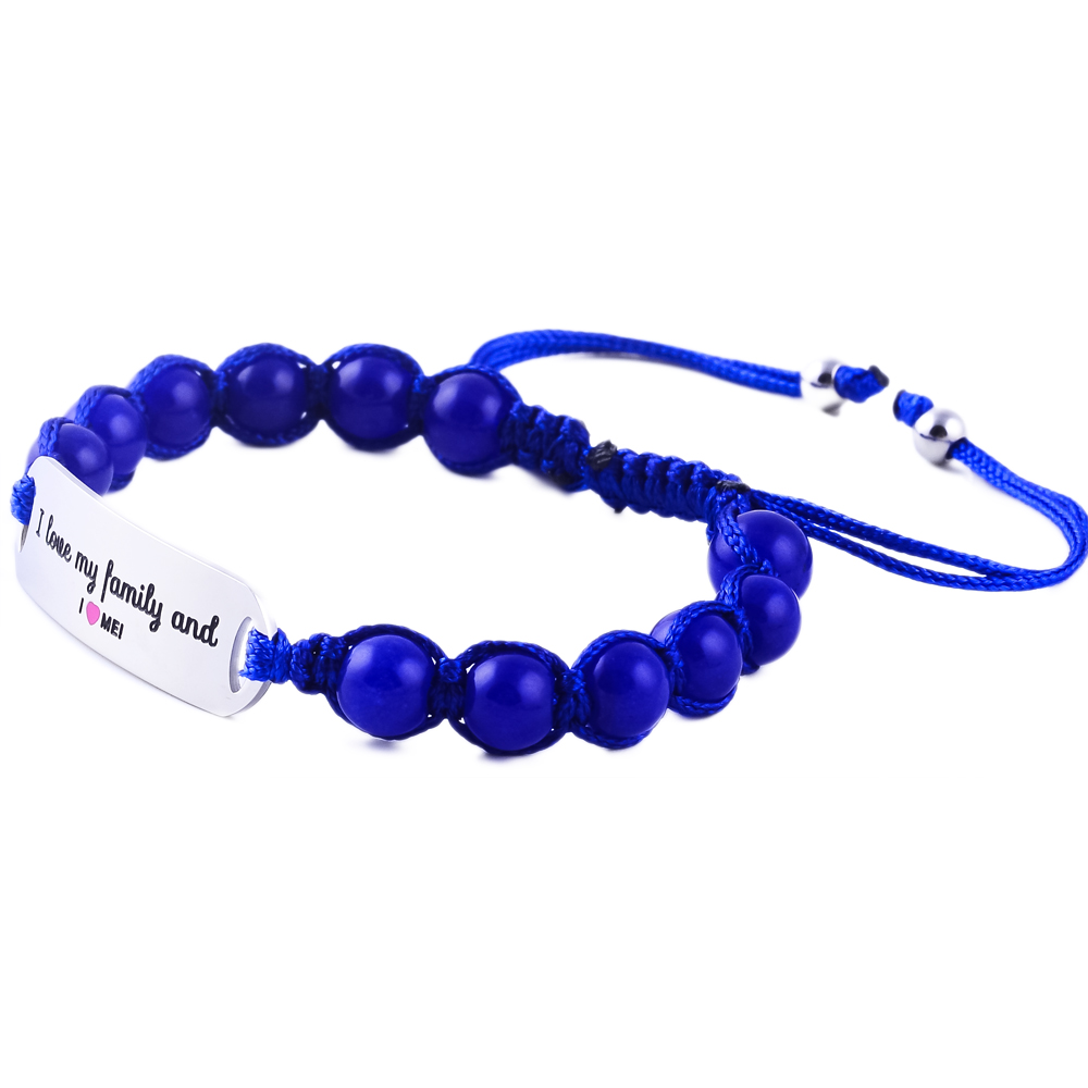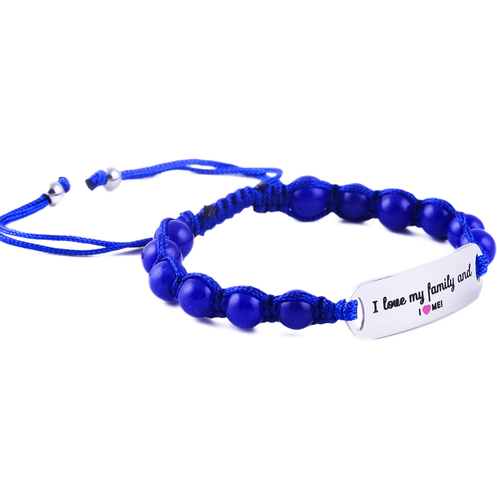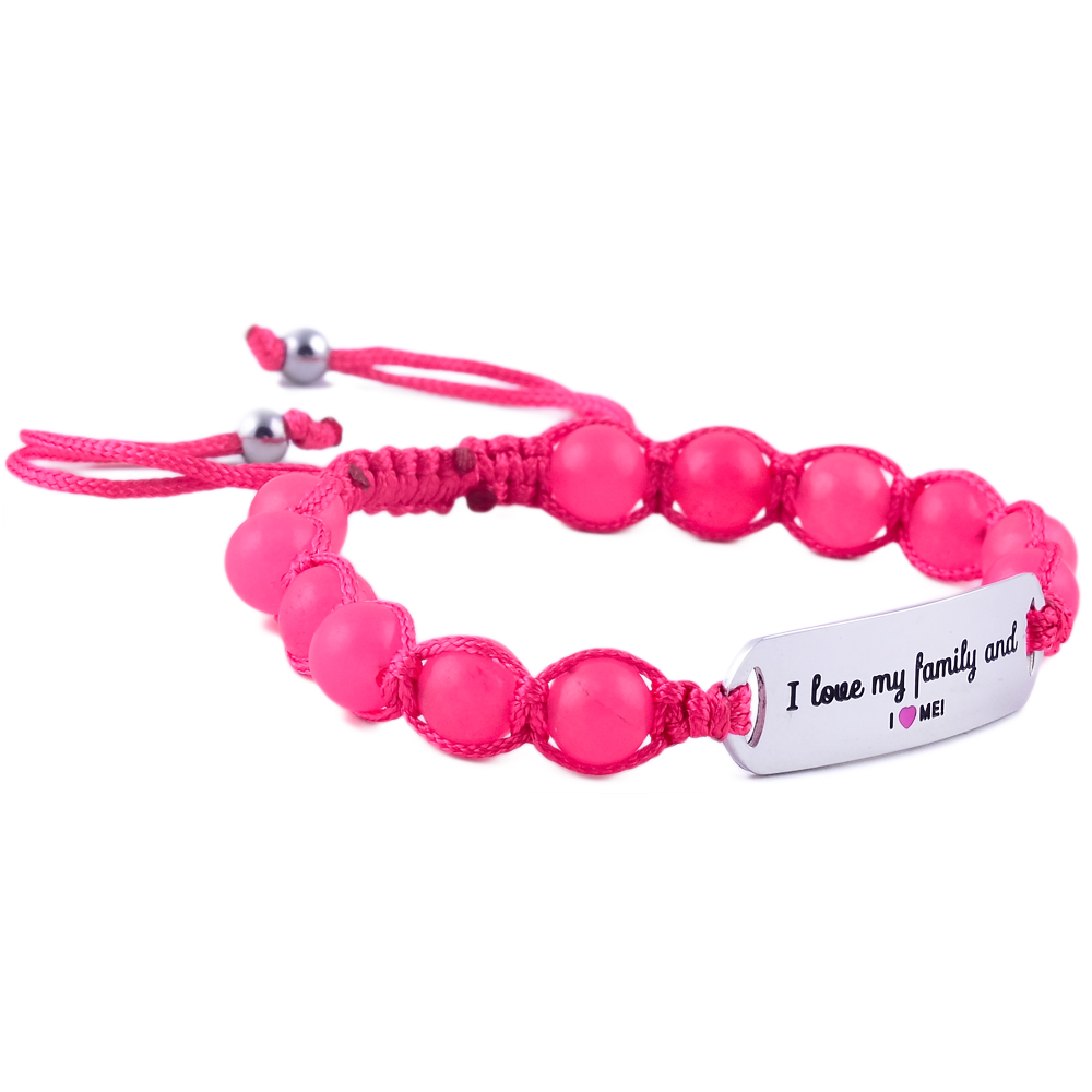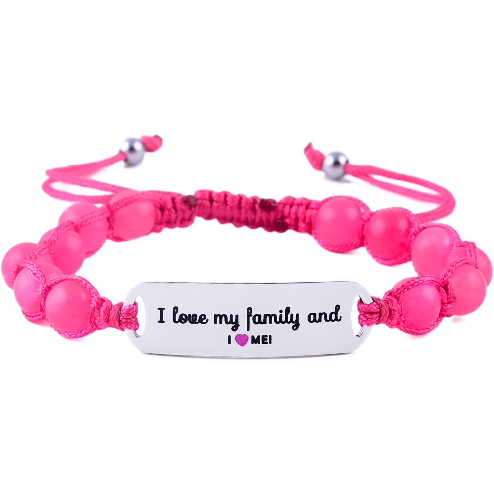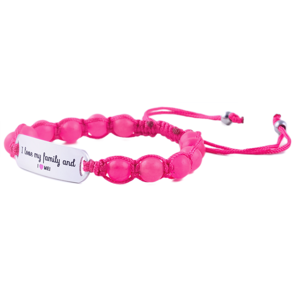 Heartwarming “I Love My Family & I Love Me” children’s bracelet in engraved stainless steel with pink or blue jade. Adjustable, sturdy, and the ideal gift for kids.