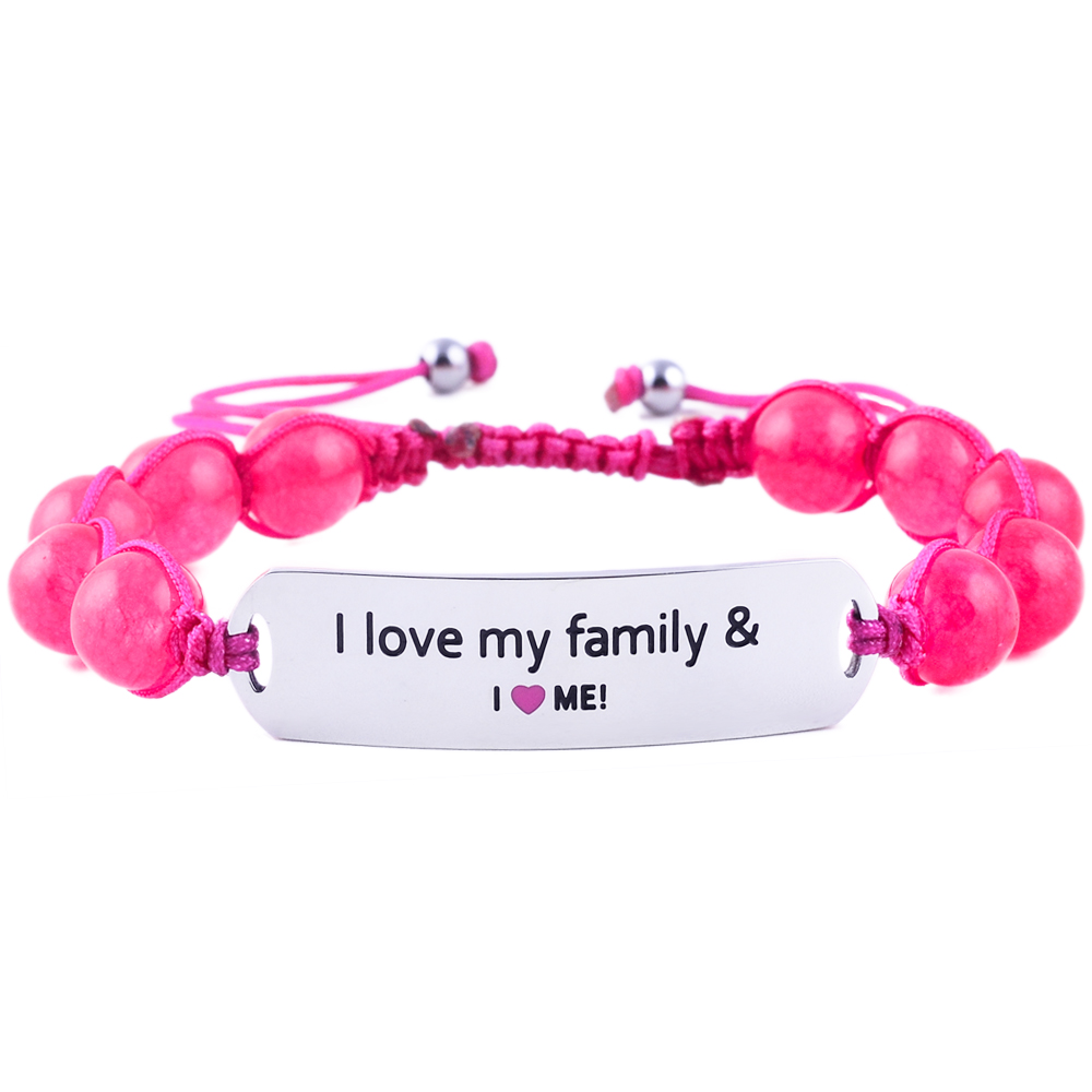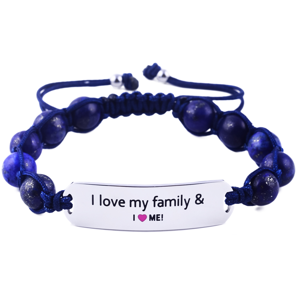 Heartfelt “I Love My Family &” bracelet in engraved stainless steel with stones. Adjustable (15.5-23.5 cm), non-allergenic, and ideal for daily wear or active moments.