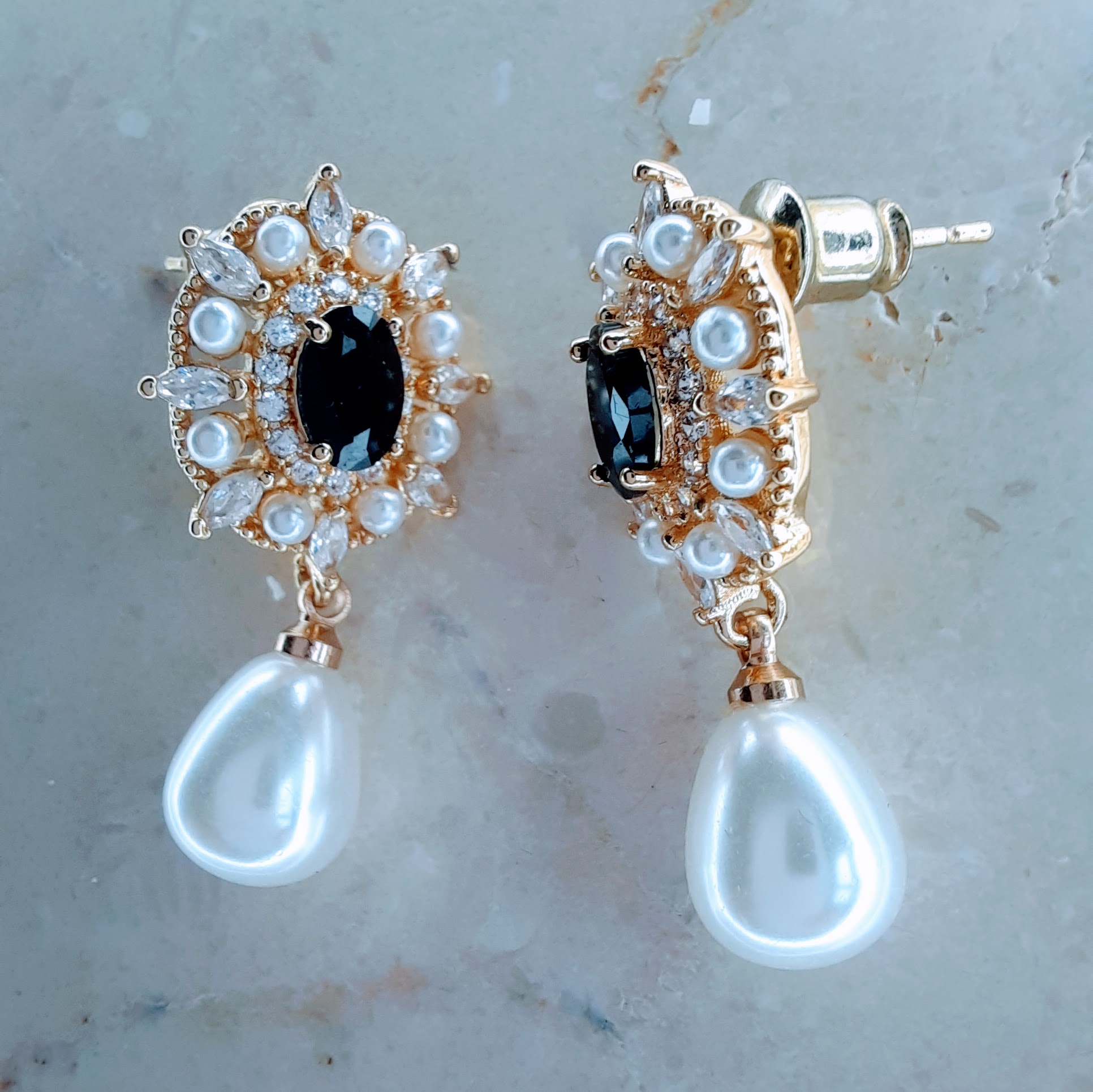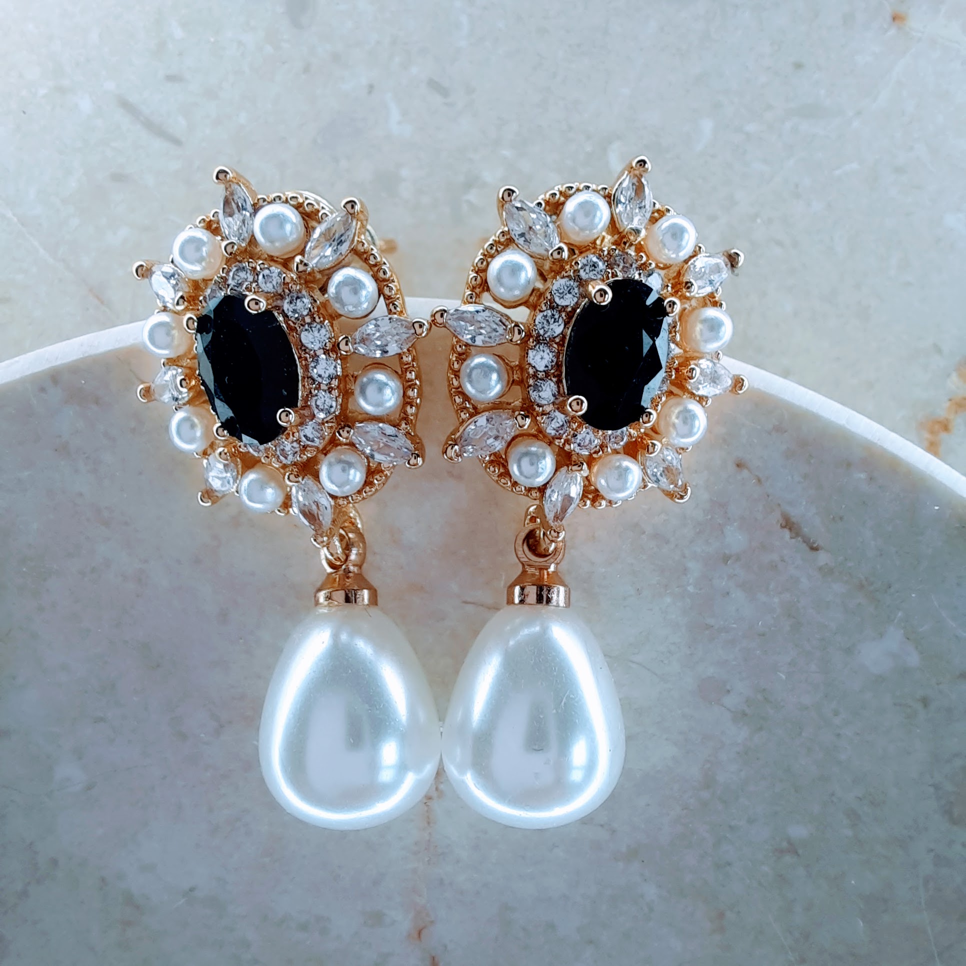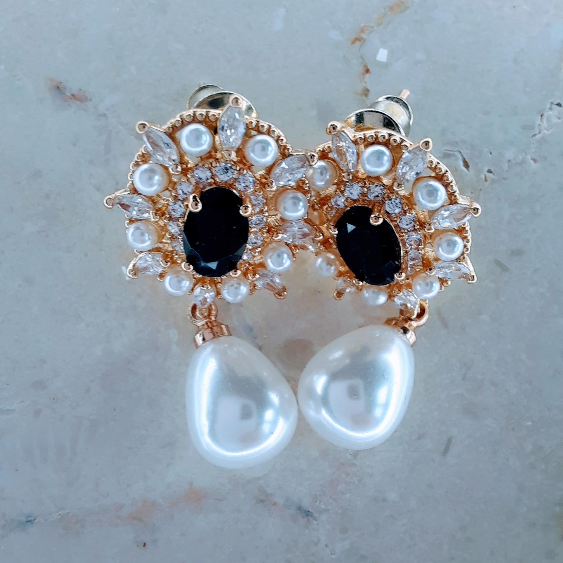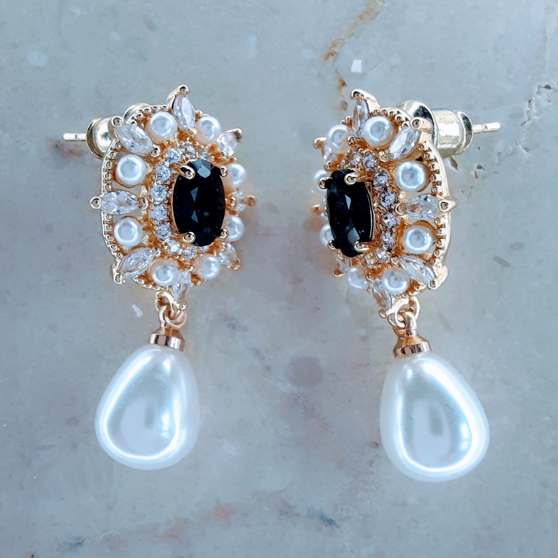 Luxurious black stone and pearl drop earrings in gold-toned setting with hand-set crystals. Featuring a central black gem, petite pearls, and a dangling teardrop pearl—perfect for elegant occasions.