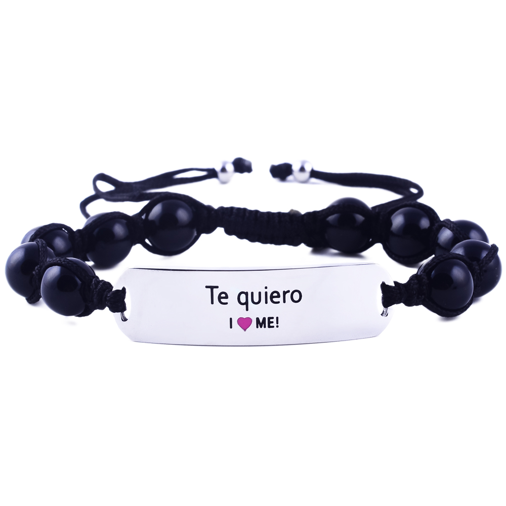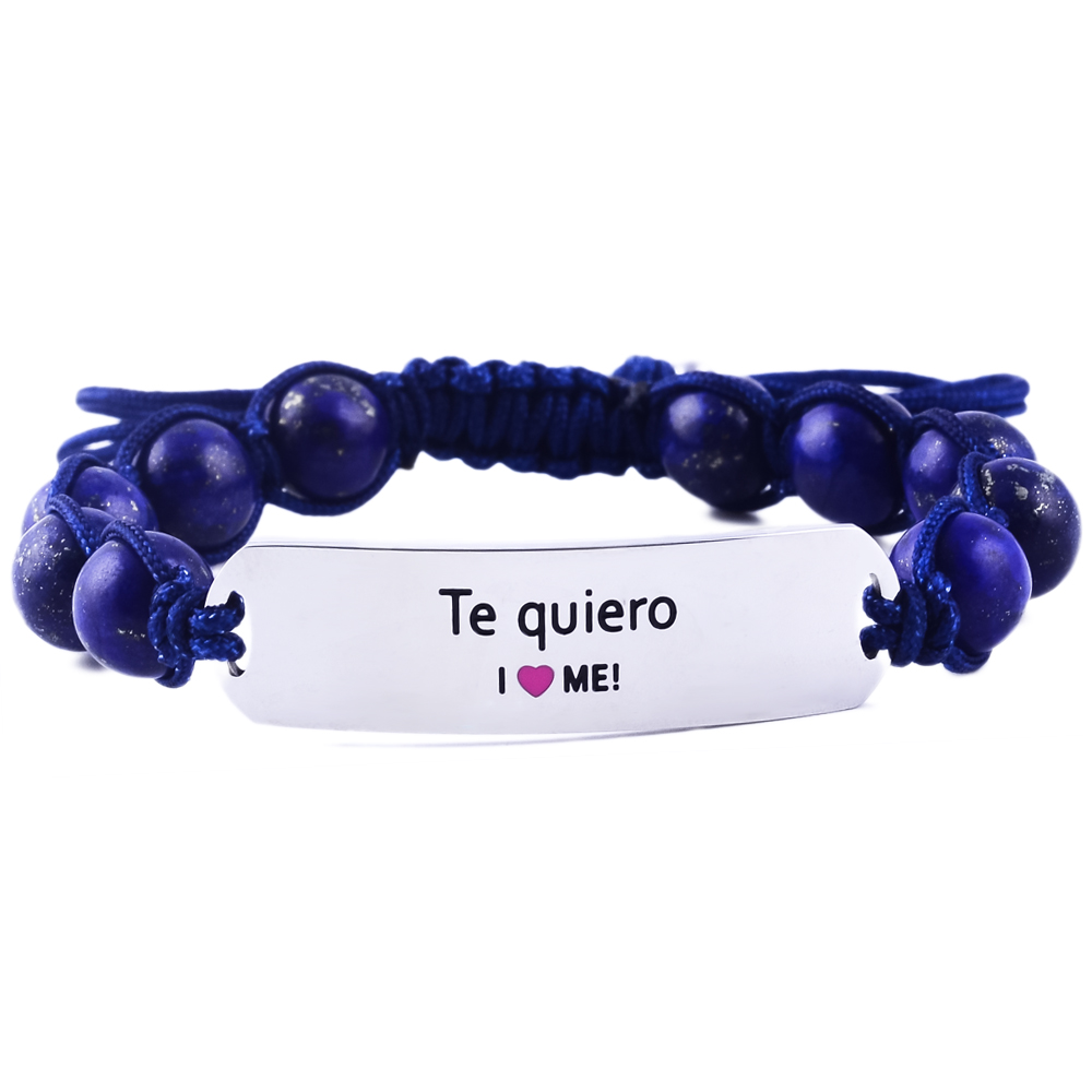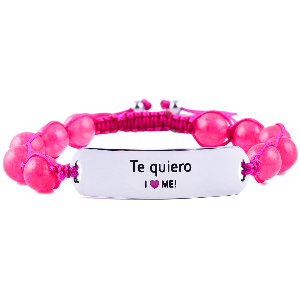 Pulsera romántica “Te Quiero” en acero inoxidable grabado con gemas naturales. Ajustable (15,5-23,5 cm), hipoalergénica y diseñada para uso diario o momentos especiales.