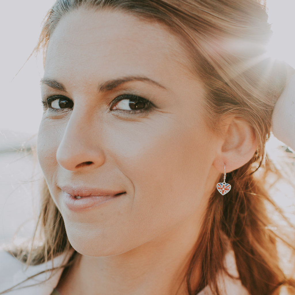 Stunning UK flag earrings in rhodinated sterling silver with hand-painted enamel and a sparkling crystal. Choose dangle or stud styles—perfect for British pride or elegant daily wear.